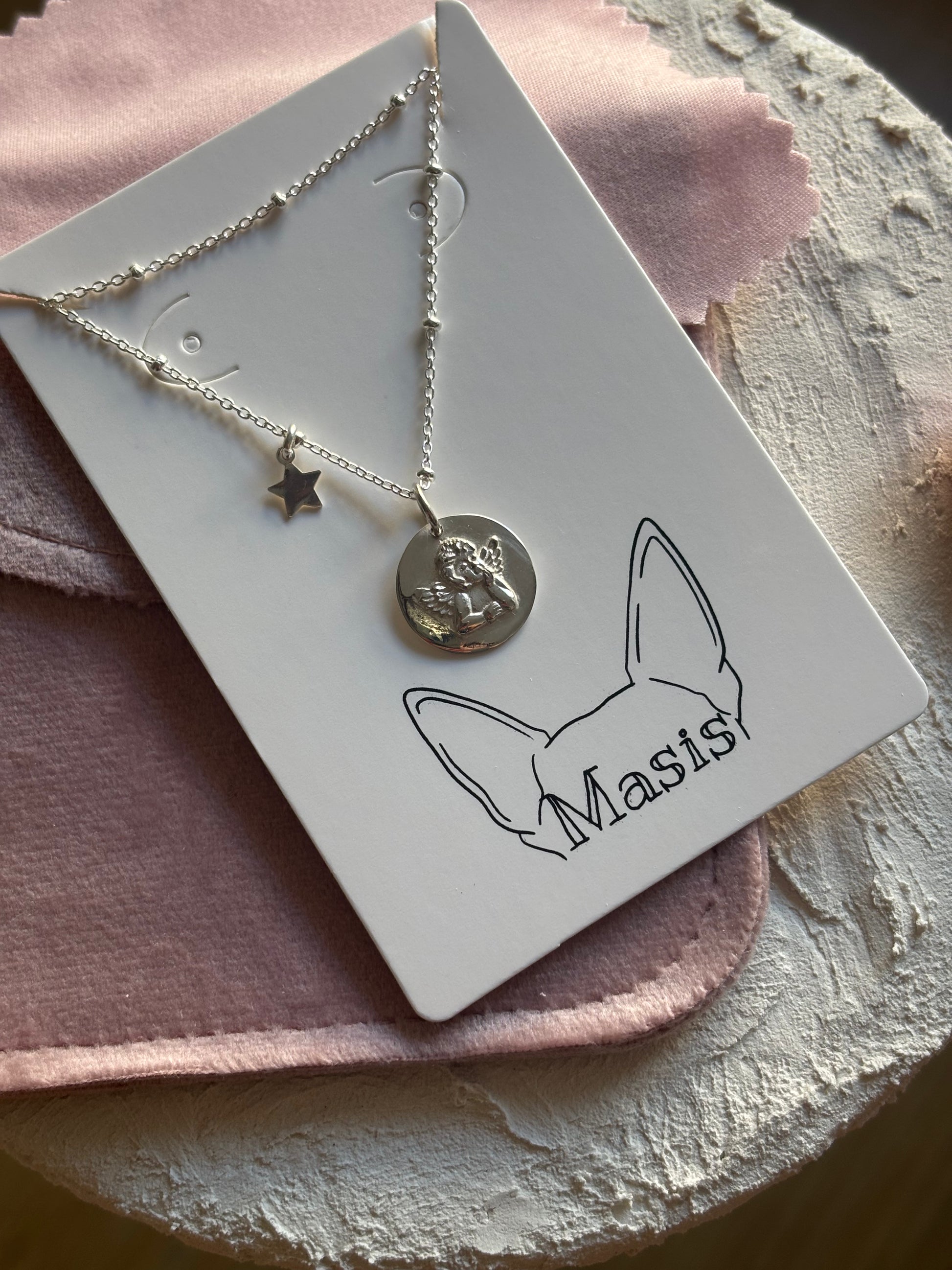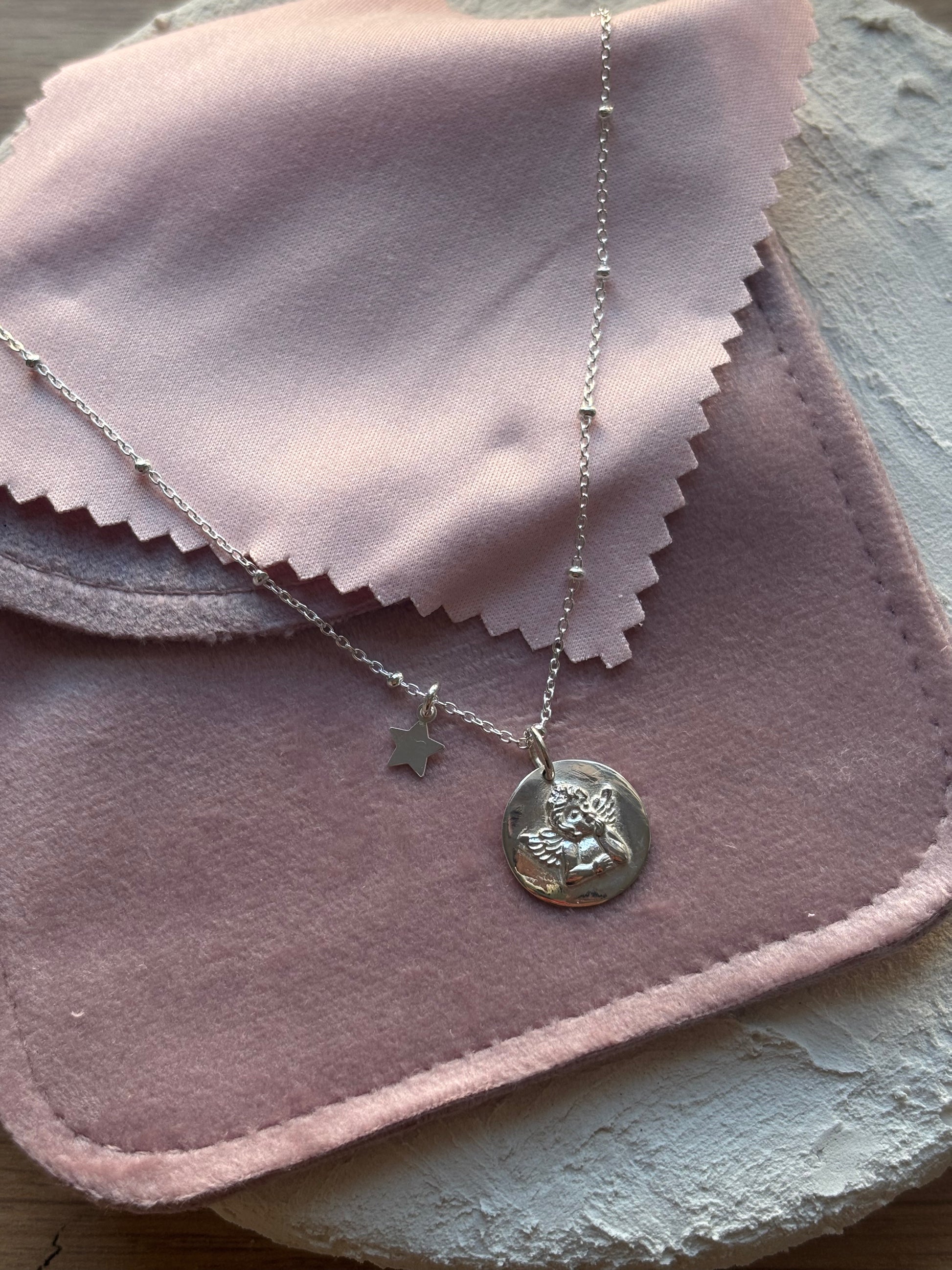 Casi todos tenemos un ángel de la guarda que nos ve y nos protege, llévalo contigo siempre! Todo en plata, 925 con garganta de 40 cm, y si lo deseas puedes grabarlo por la parte de detrás con un nombre, fecha o ambos.