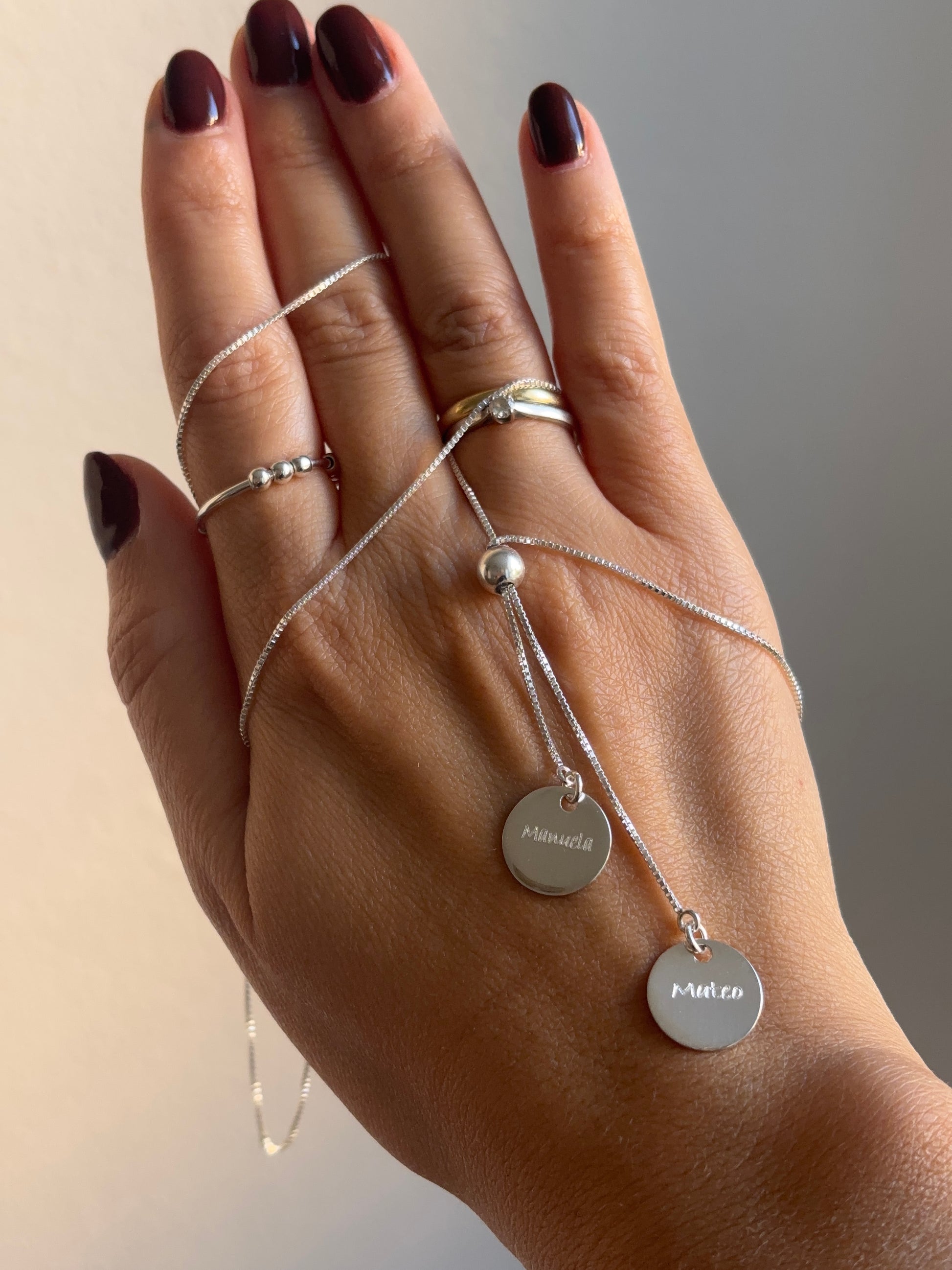 Gargantilla Corbatera de plata, 925 con dos medallas para personalizar de 13 mm! Perfecta para escribirle nombres, fechas o palabra…. Su cierre es la bolita que se mueve hacia arriba allá abajo con un sistema de silicona interior, que hace que se quede acoplado a la altura que tú quieras!