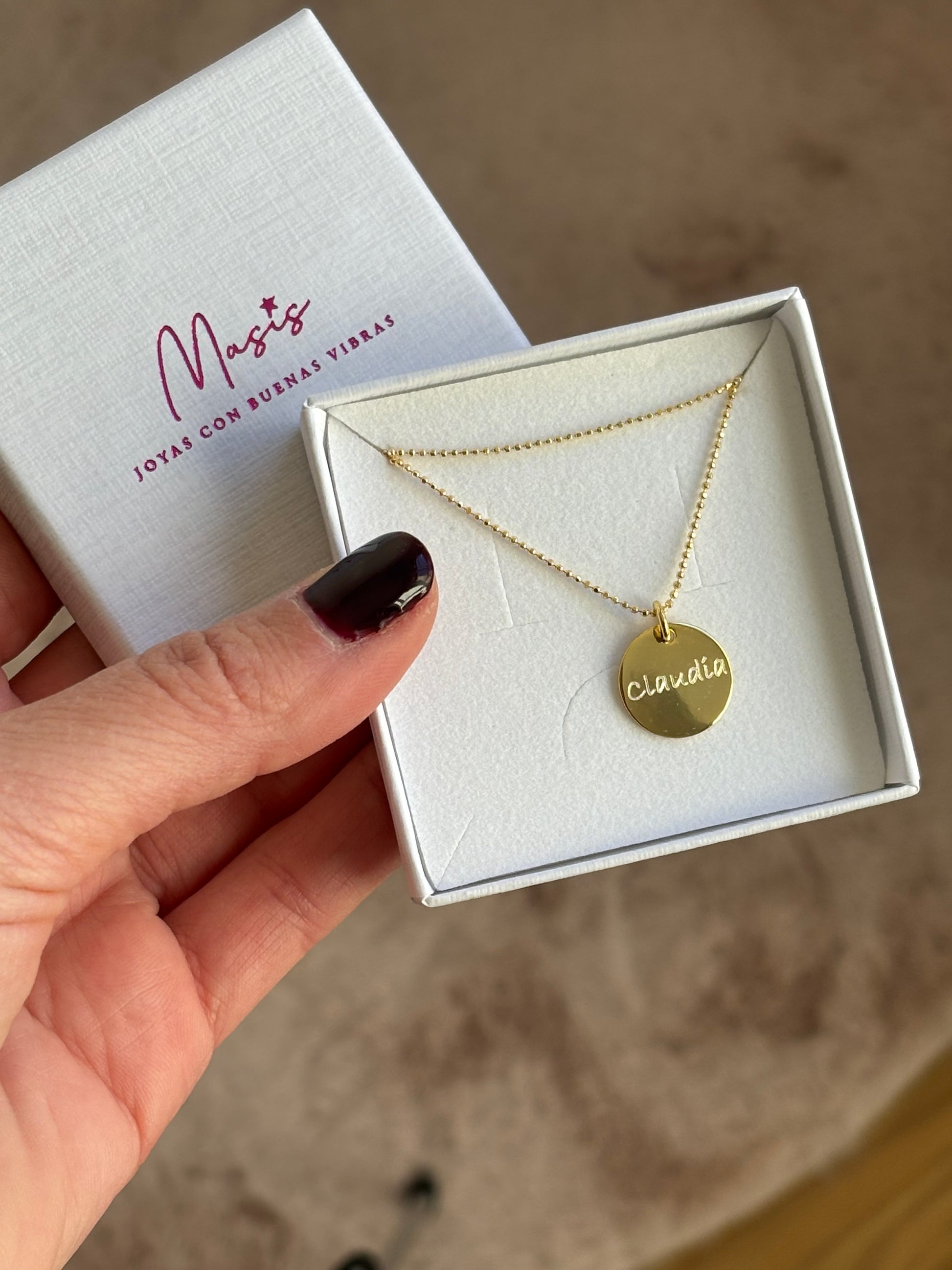 Gargantilla de plata, 925 Chapada en oro de cinco micras, con una cadena de bolita diamantado y una medalla de 15 mm para que puedas grabar lo que quieras por delante y por detrás