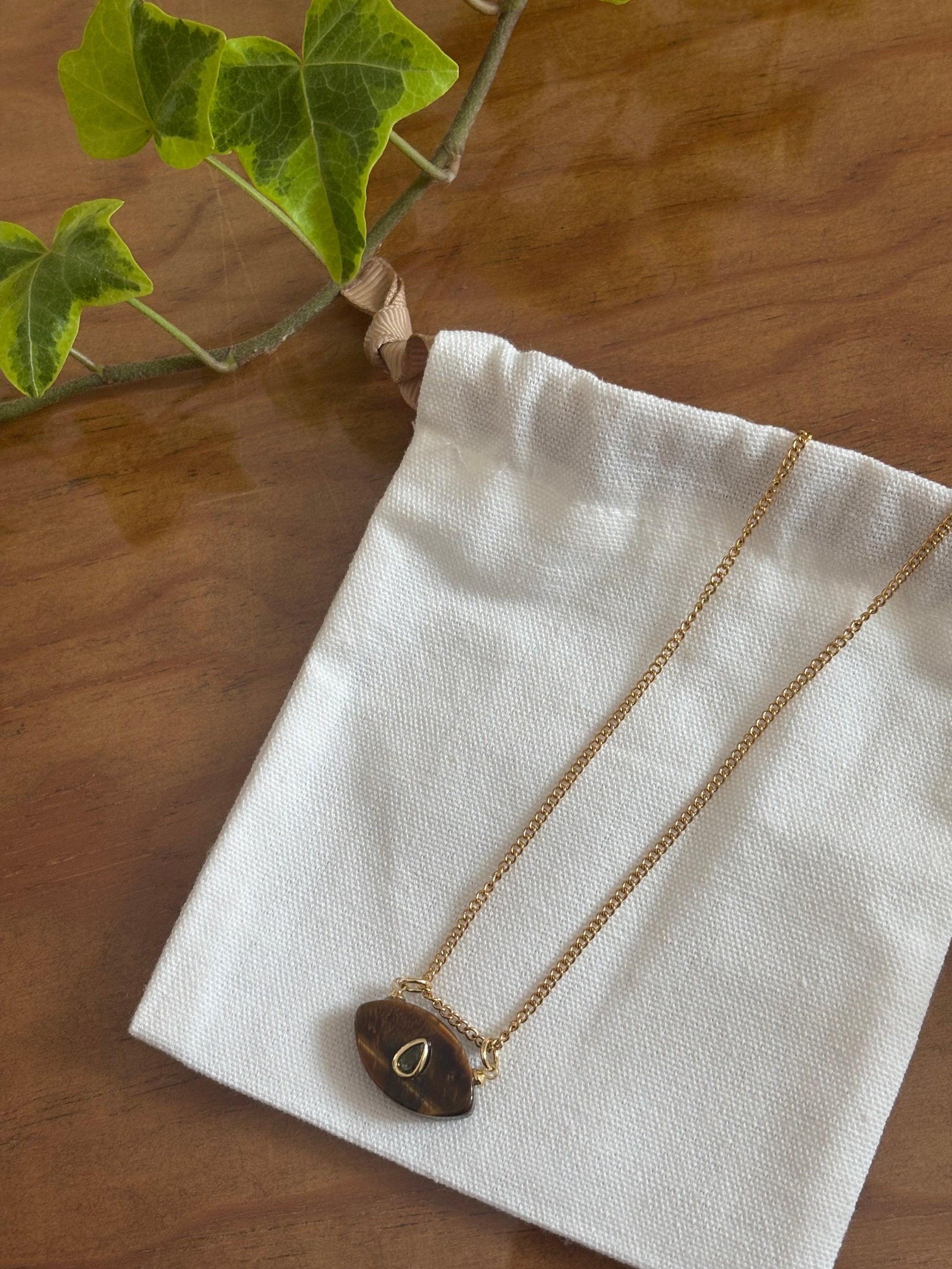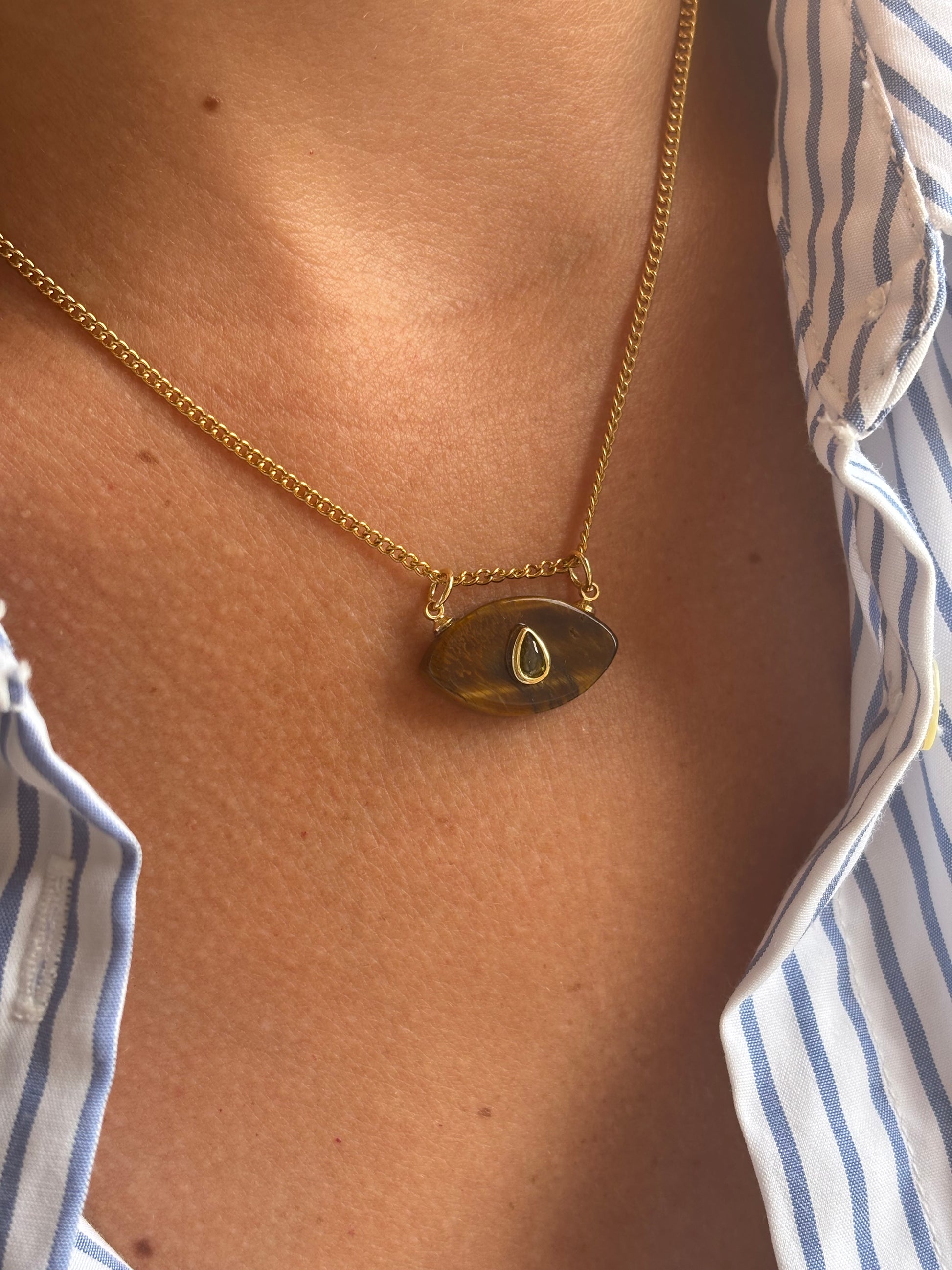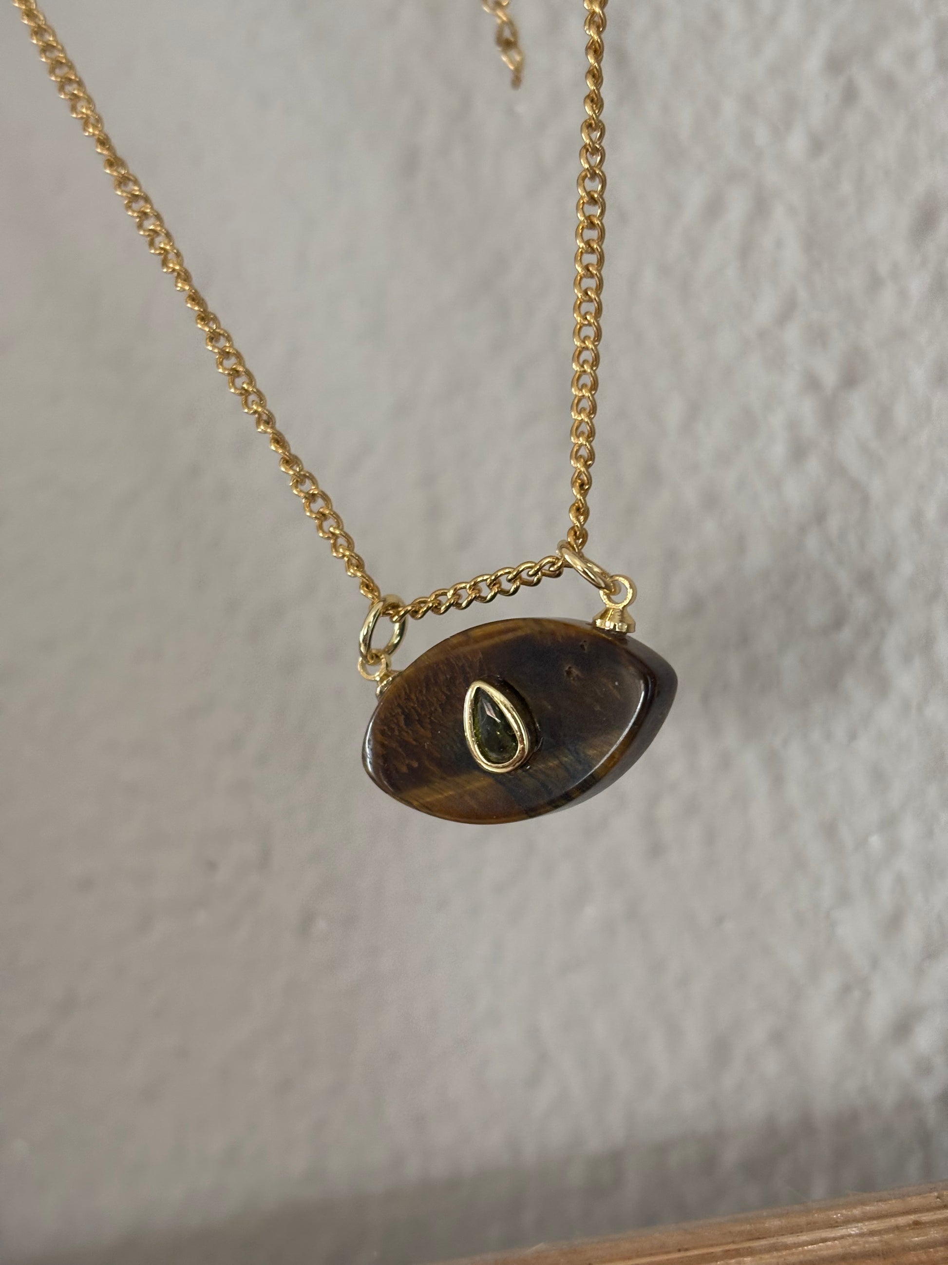 Gargantilla con piedra ojo de tigre en forma de ojo, un símbolo de protección y claridad que ayuda a mantener el equilibrio y alejar energías negativas. En el centro, la circunferencia potencia la intuición y aporta armonía. La cadena es de acero inoxidable.
