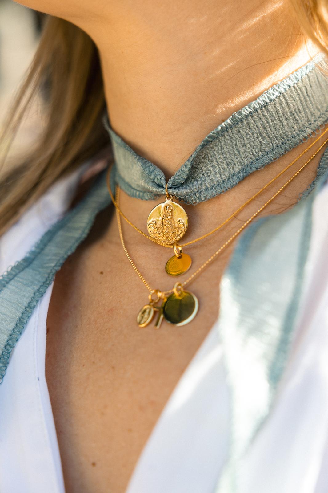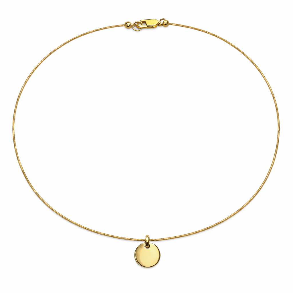 Gargantilla con cordón de algodón en tono dorado y medalla redonda de 10 mm en plata de ley 925 chapada en oro de 5 micras. Puedes personalizar la medalla con una inicial, una palabra o un símbolo.