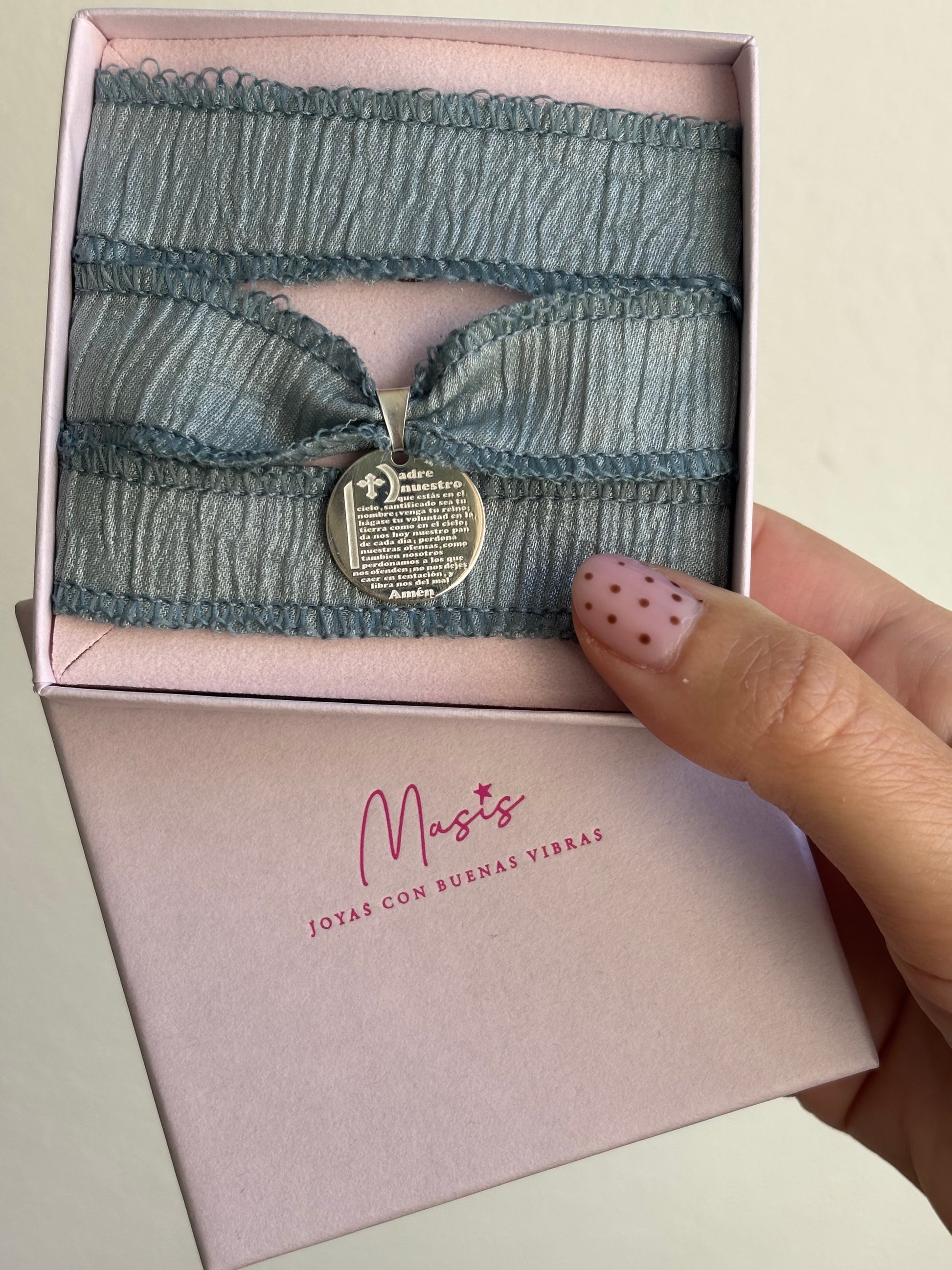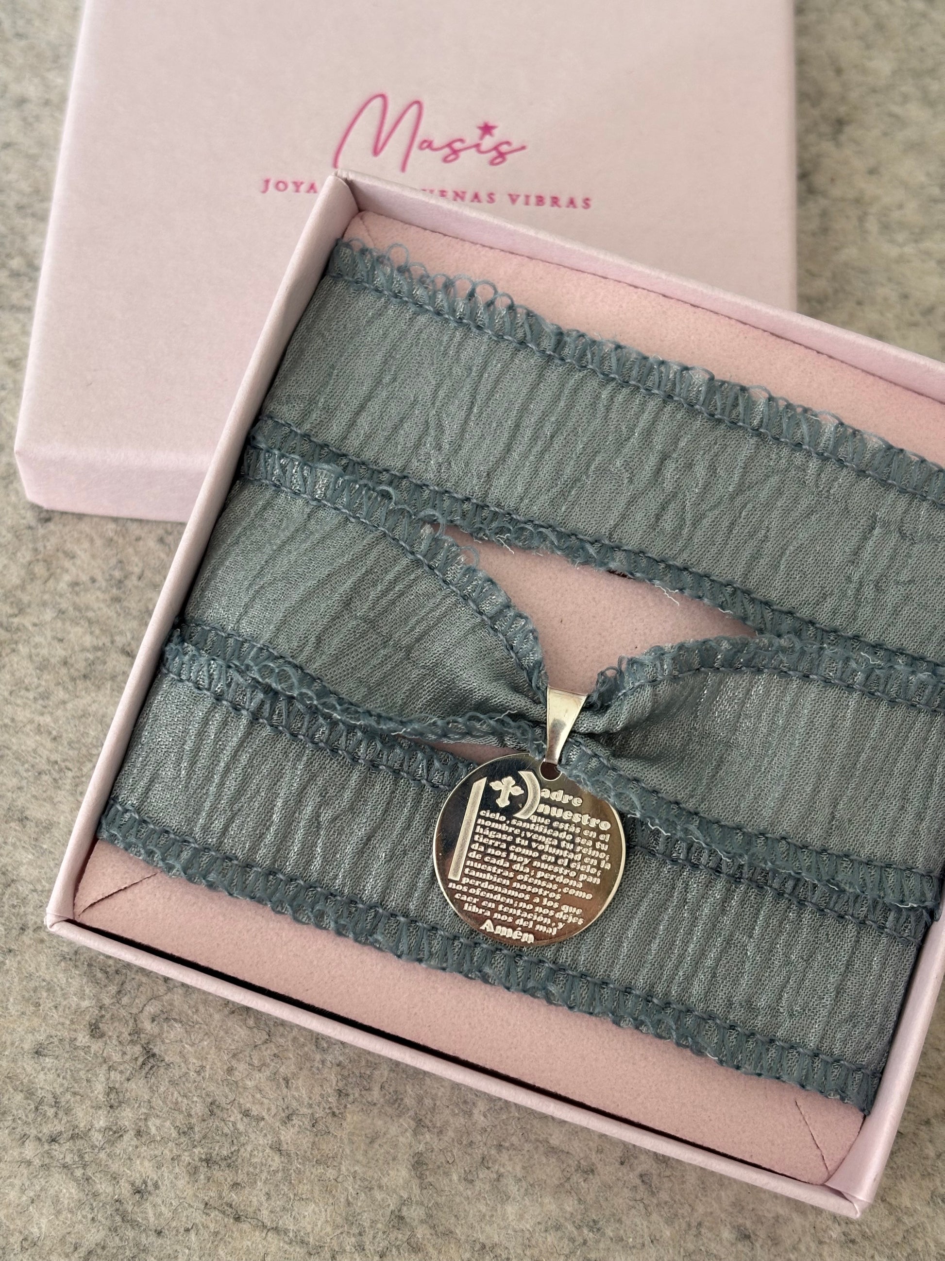Medalla de plata de 20 mm con el rezo de padre nuestro en plata, con la disponibilidad de poder añadir un personalizado por la parte de detrás
