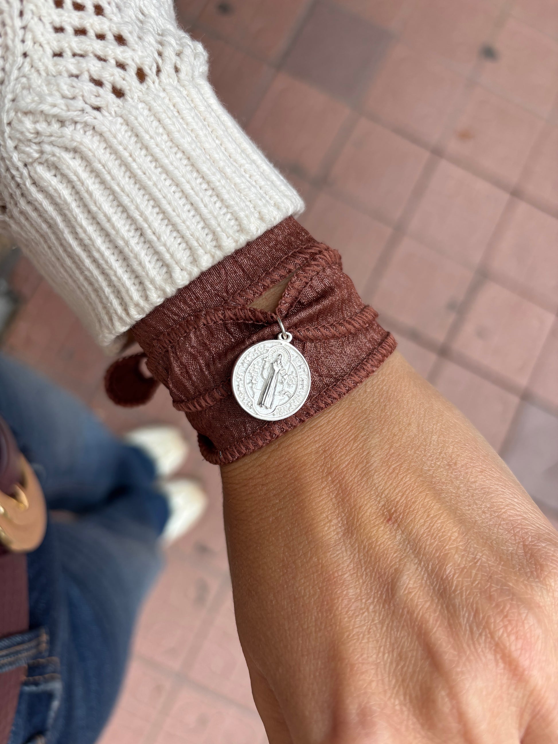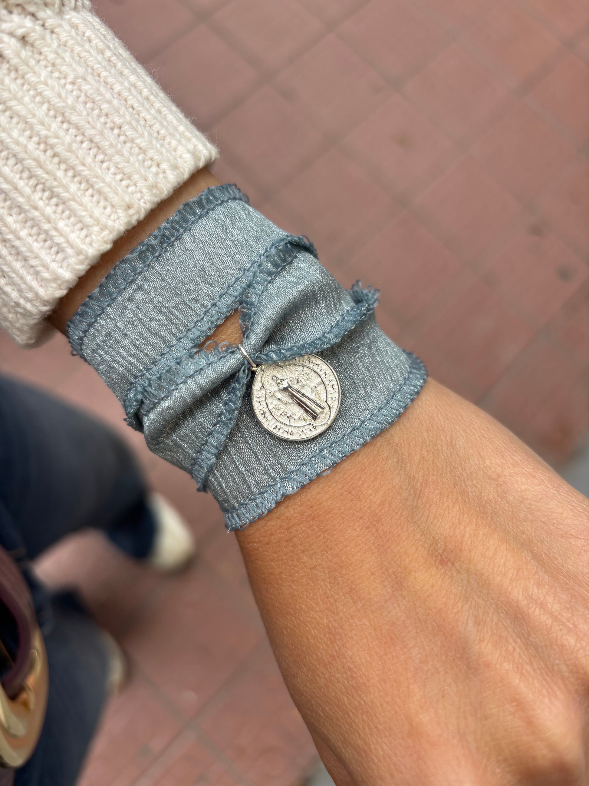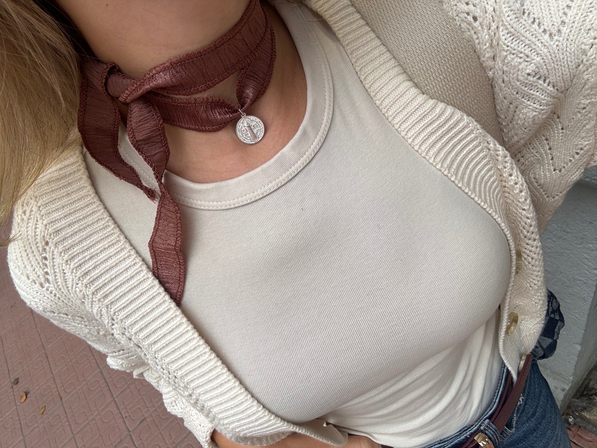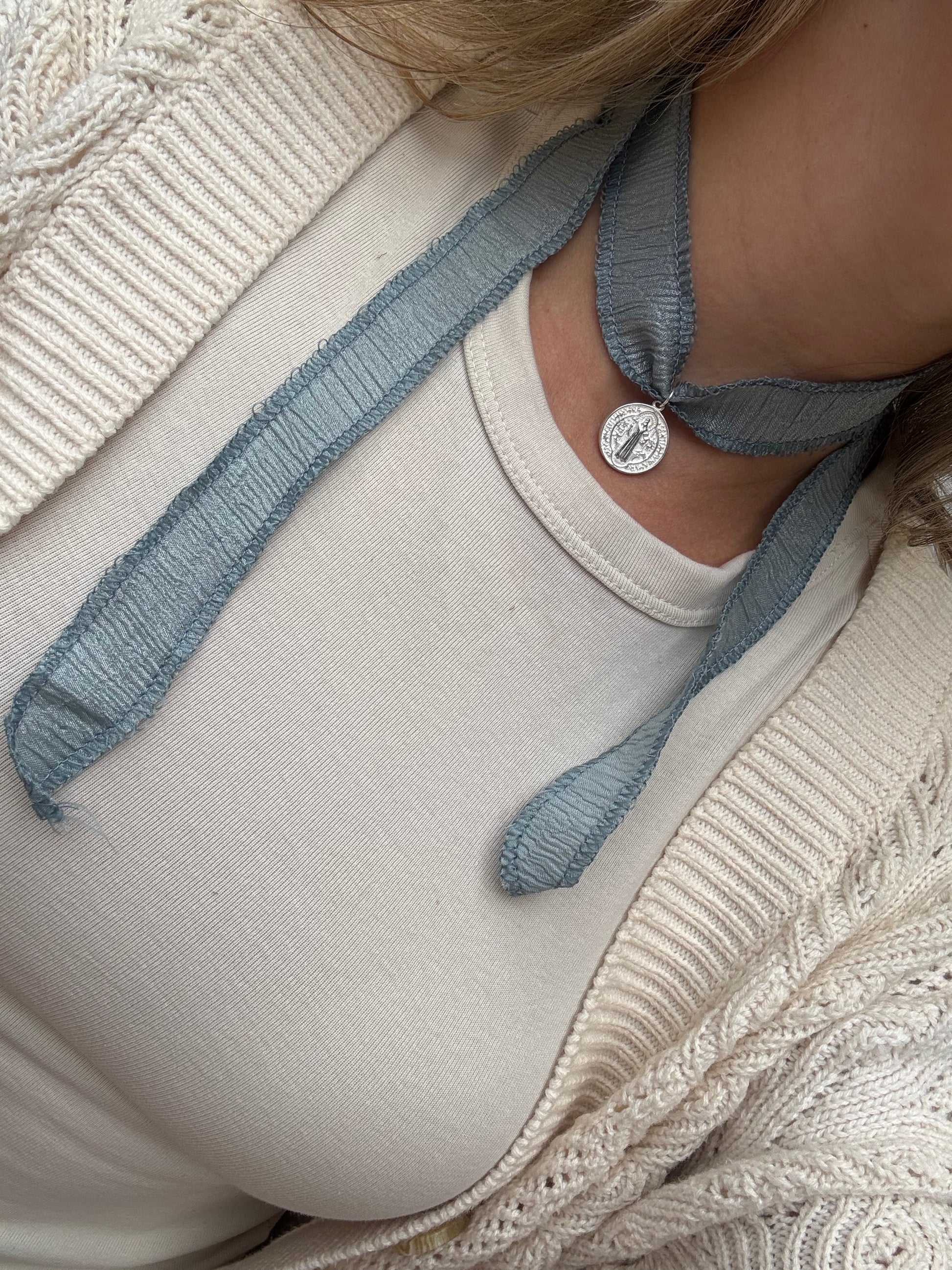Incluye cinta de seda en marrón chocolate o azul cielo, adaptable como pulsera o gargantilla.