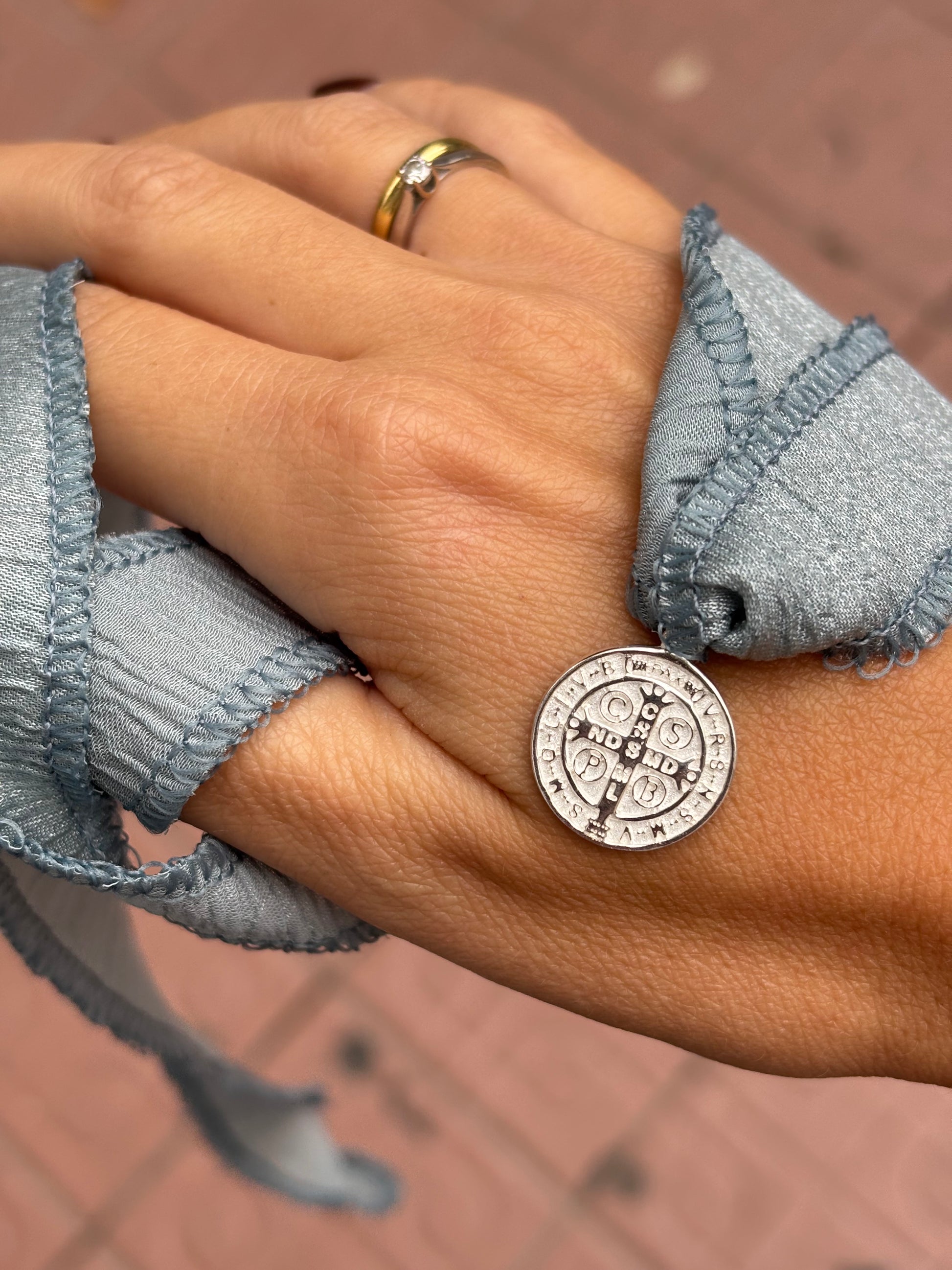 Con la imagen de San Benito al frente y su cruz al reverso, símbolo de protección y fe.