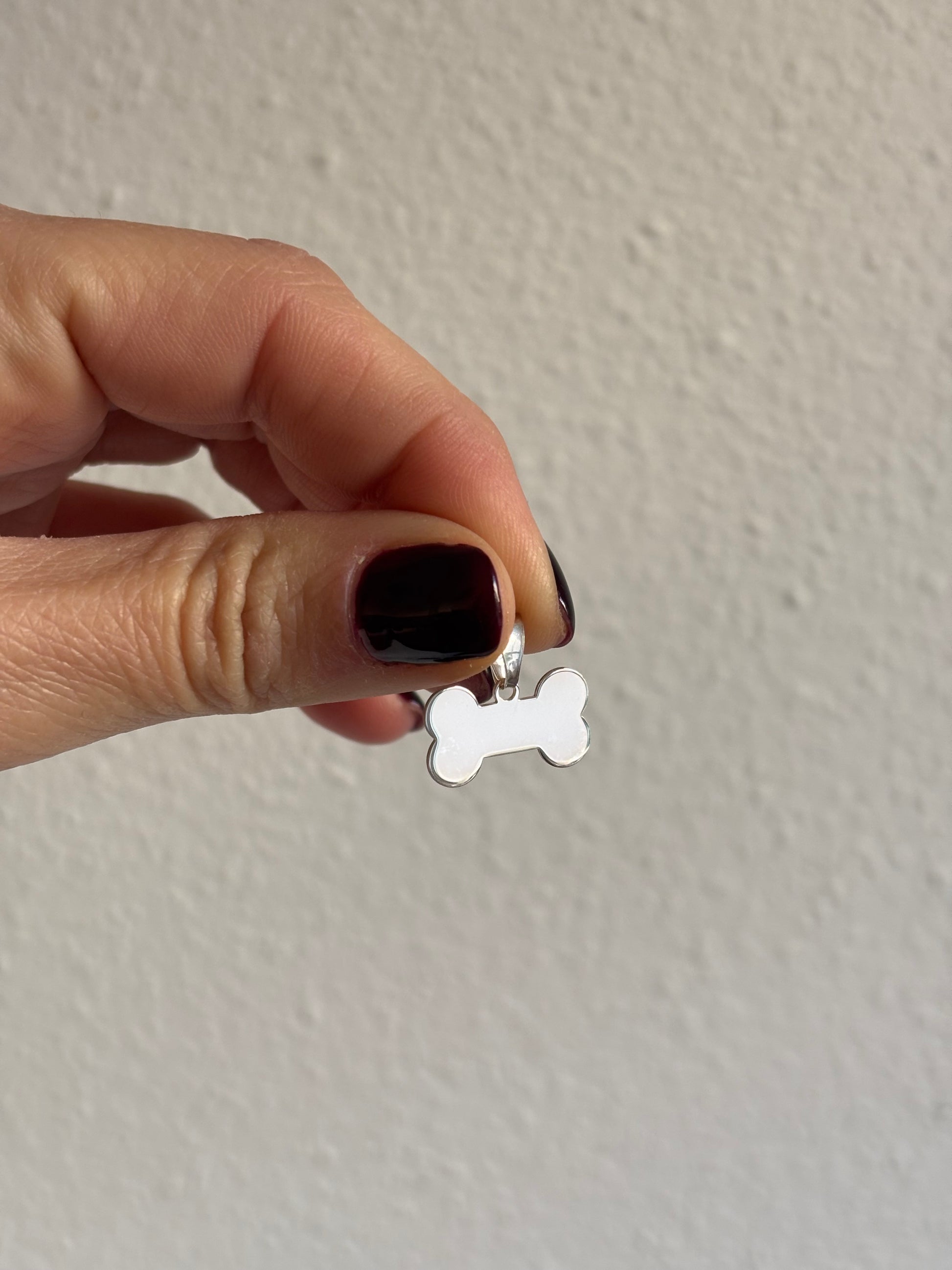 Medalla con forma de hueso de 15 mm, disponible para grabar por delante y por detrás. Perfecta para personalizar con el nombre de tu perro, una fecha especial o cualquier palabra con significado.