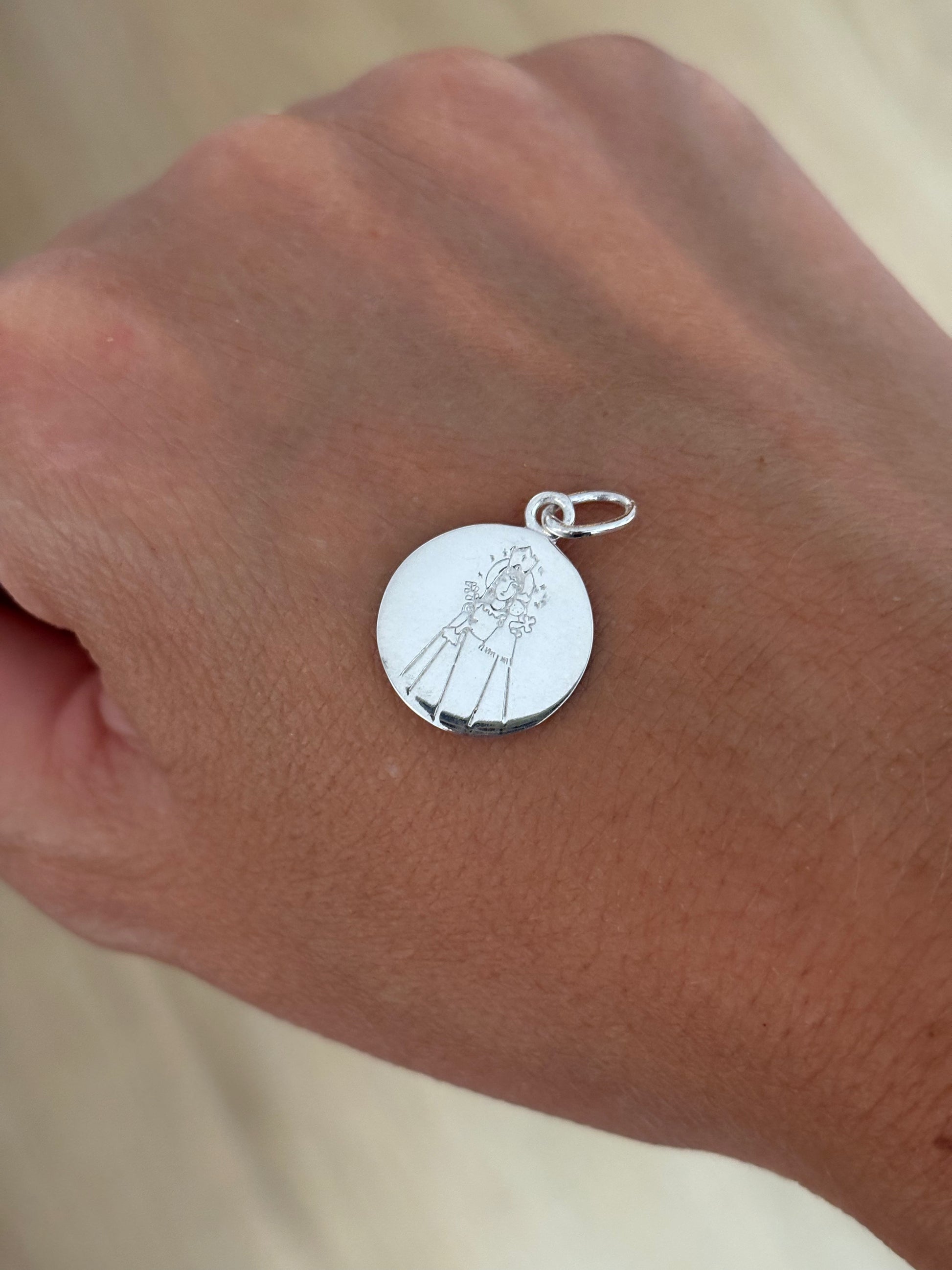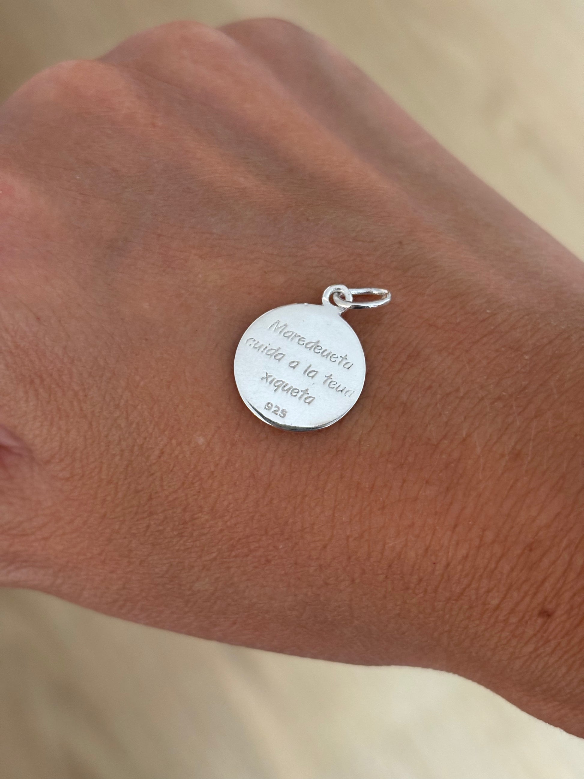medalla en plata de ley con la Virgen de los Desamparados en una cara, y el texto "Maredeueta, cuida a tu xiqueta".