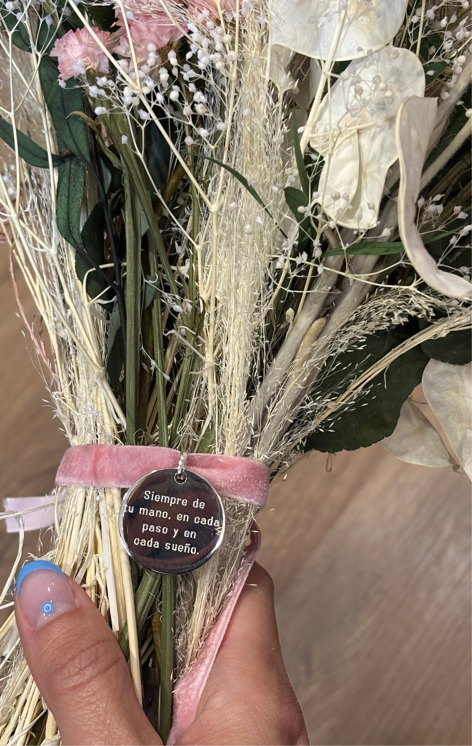 Elegante medalla de plata 925 de 25 mm, perfecta para personalizar ramos de novia o las réplicas destinadas a madres, suegras, hermanas, amigas u otras personas especiales. Un detalle delicado y significativo para conservar y compartir un recuerdo inolvidable.