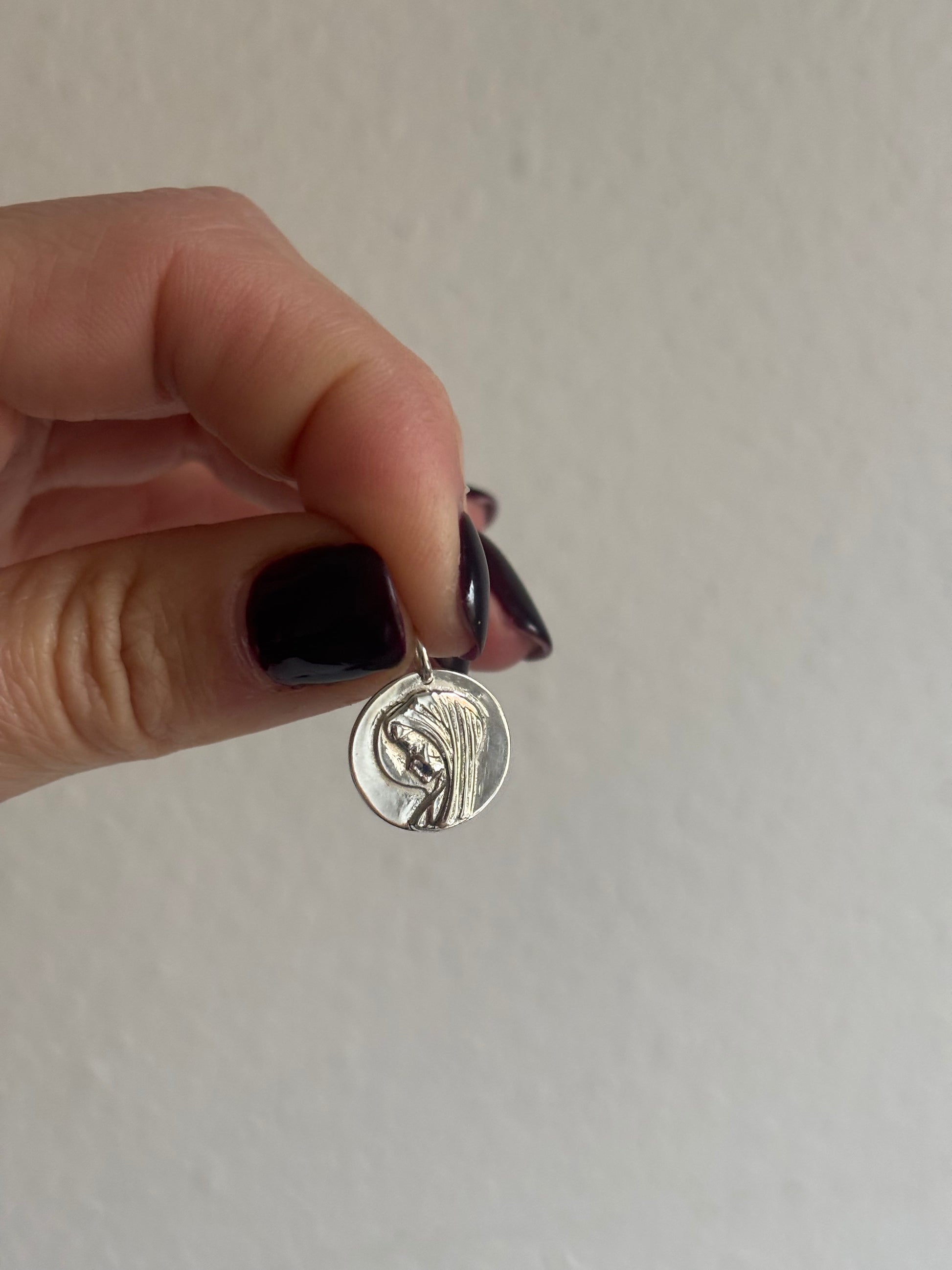 Medalla de la virgen niña de plata 925 , Ideal para combinarla con sedas, añadir a una pulsera o una cadena, Es perfecta para regalo de comunión. Además, tienes la opción de grabarla por la parte trasera.