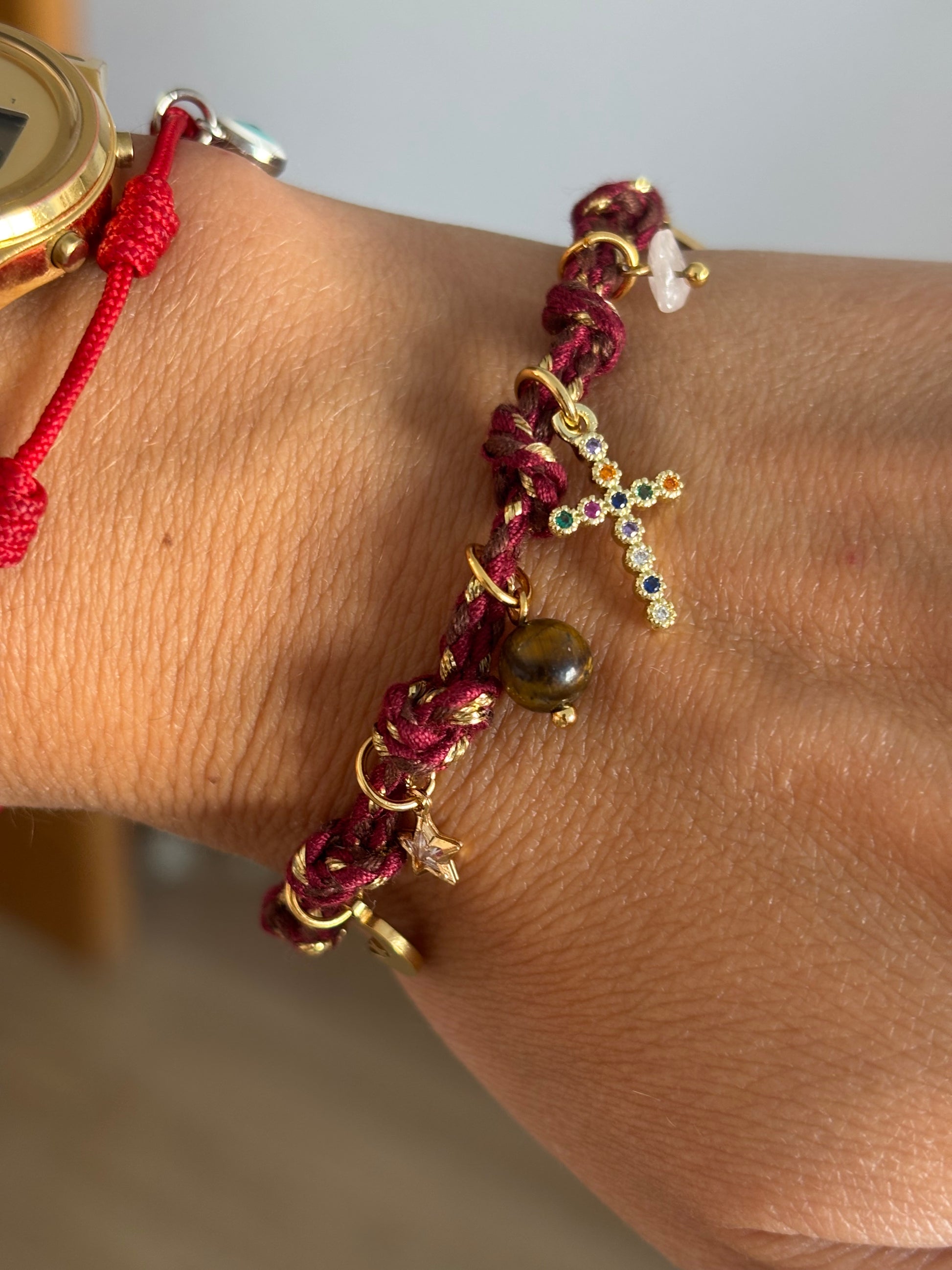 Sus dijes —⚡ rayo (energía), ✝️ cruz con piedras de colores (esperanza), 🌙 luna (guía) y ⭐ estrellas (inspiración)— hacen de Gratitud un amuleto único para llevar cada día.