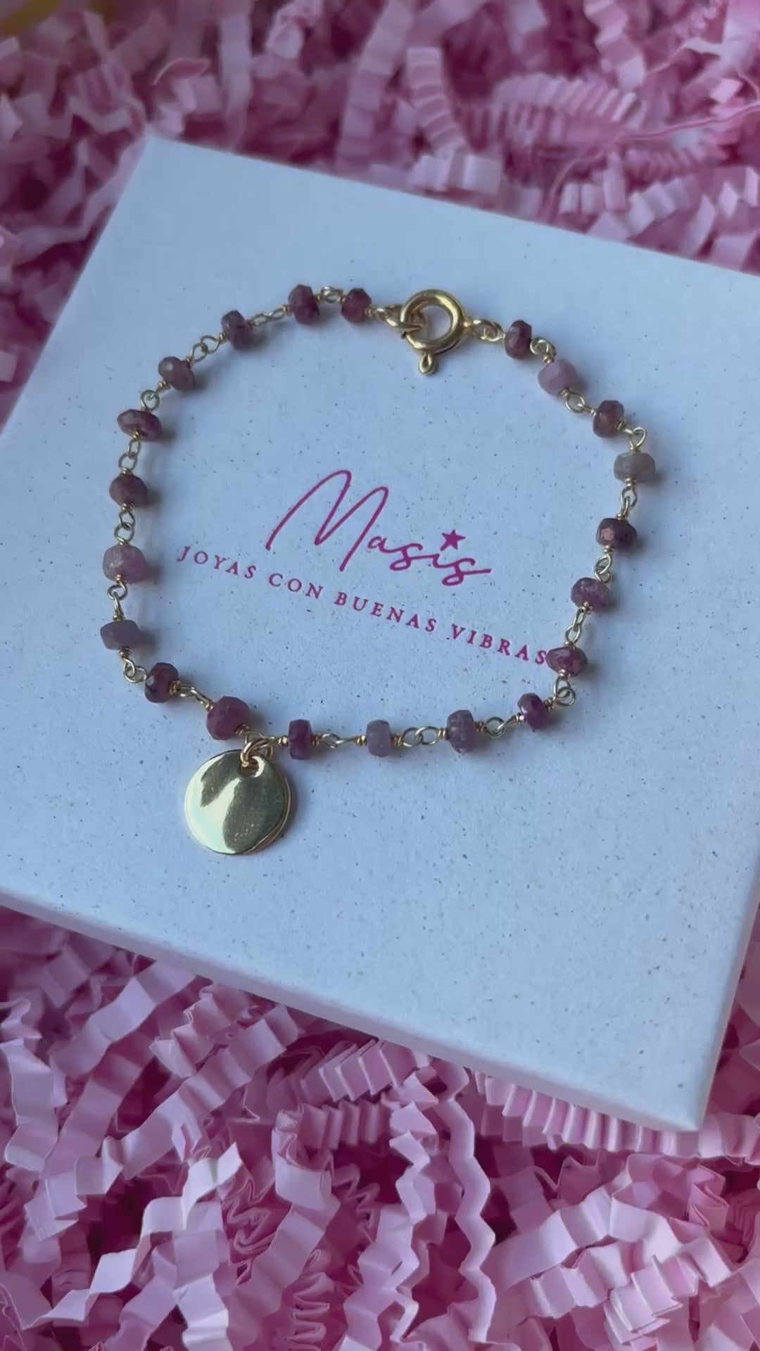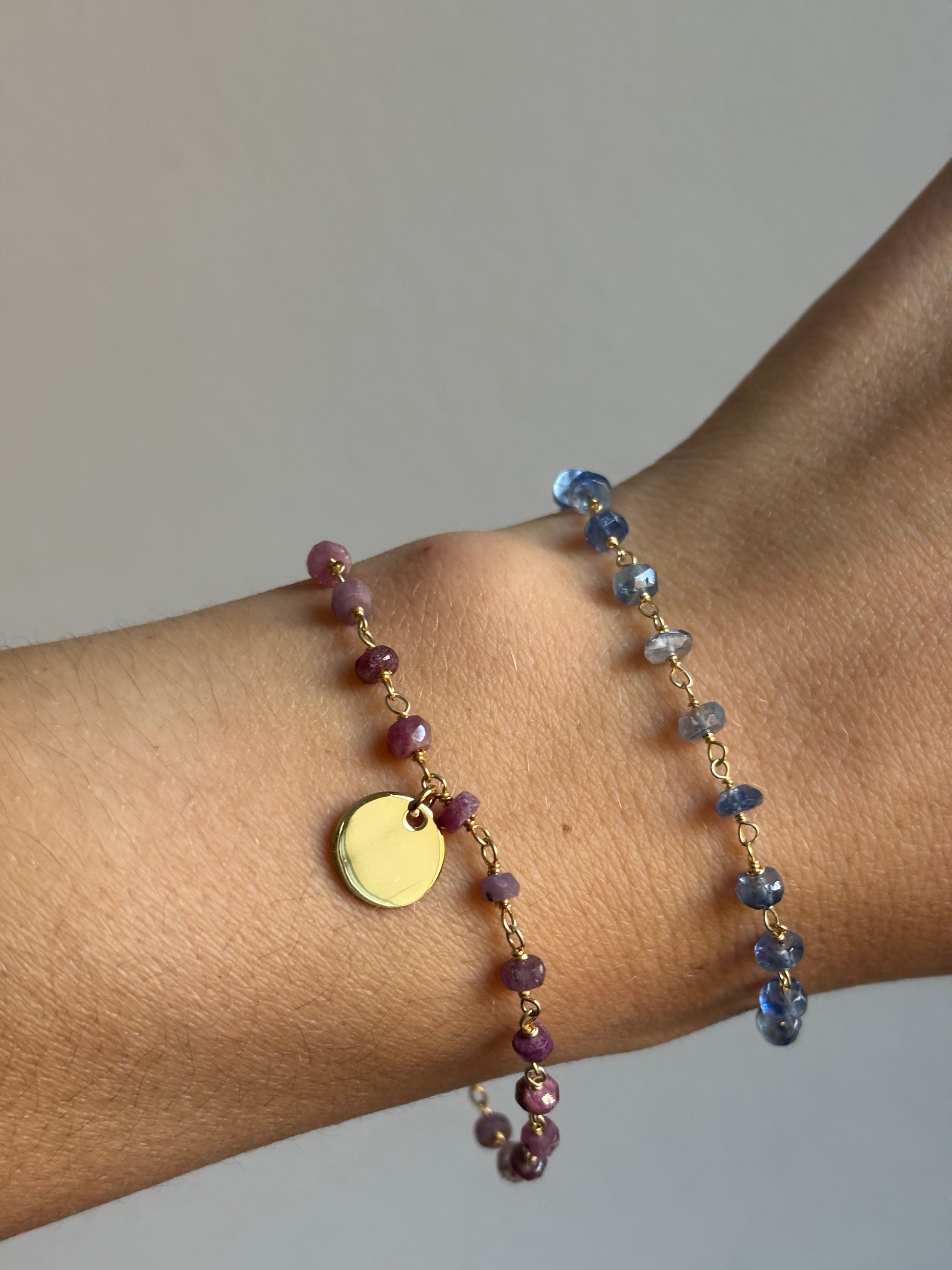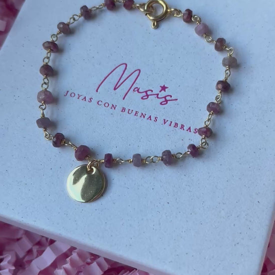 Pulsera de piedra intercalada con iolita azul o turmalina rosa , elaborada en plata 925 chapada en oro de cinco micras. Disponible con o sin medallitas personalizadas, para que lleves un toque único y elegante en cada detalle.