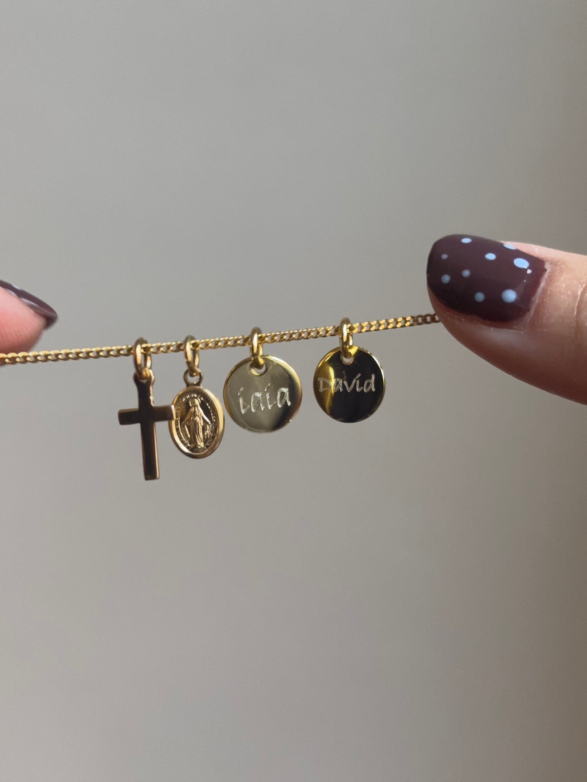 Una joya con significado y estilo. Gargantilla en plata 925 con baño de oro de 5 micras, con la Medalla Milagrosa y una cruz que simbolizan protección y fe. Incluye una medalla de 9 mm personalizable con un nombre, inicial o fecha especial. Delicada, elegante y perfecta para llevar siempre contigo o regalar con cariño. La gargantilla tiene una longitud de 45 cm